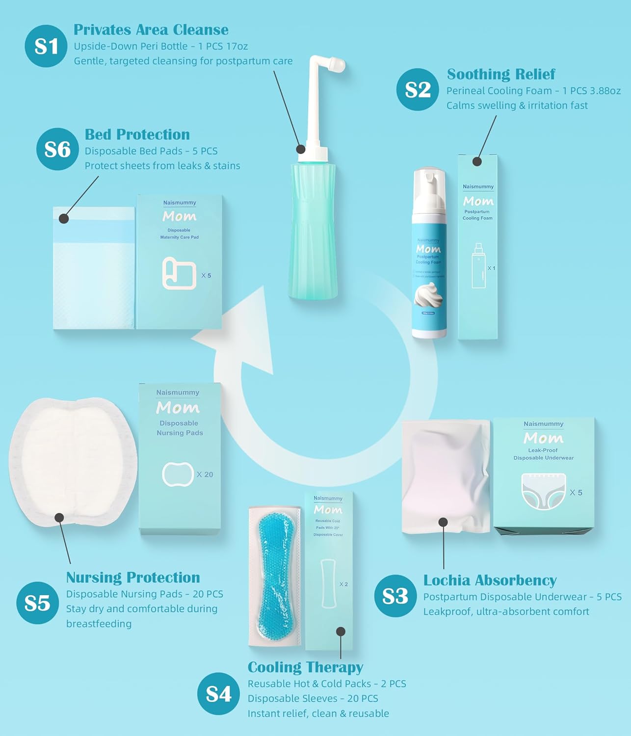 Complete Postpartum Recovery Kit – Designed to support new moms after childbirth, this 55-piece postpartum essentials kit helps promote recovery, reduce discomfort, and keep you clean and comfortable. It includes a 17oz peri bottle, perineal foam, 2 reusable ice packs with 20 disposable covers, 20 nursing pads, 5 disposable postpartum underwear, 5 disposable bed pads, and a convenient storage bag.